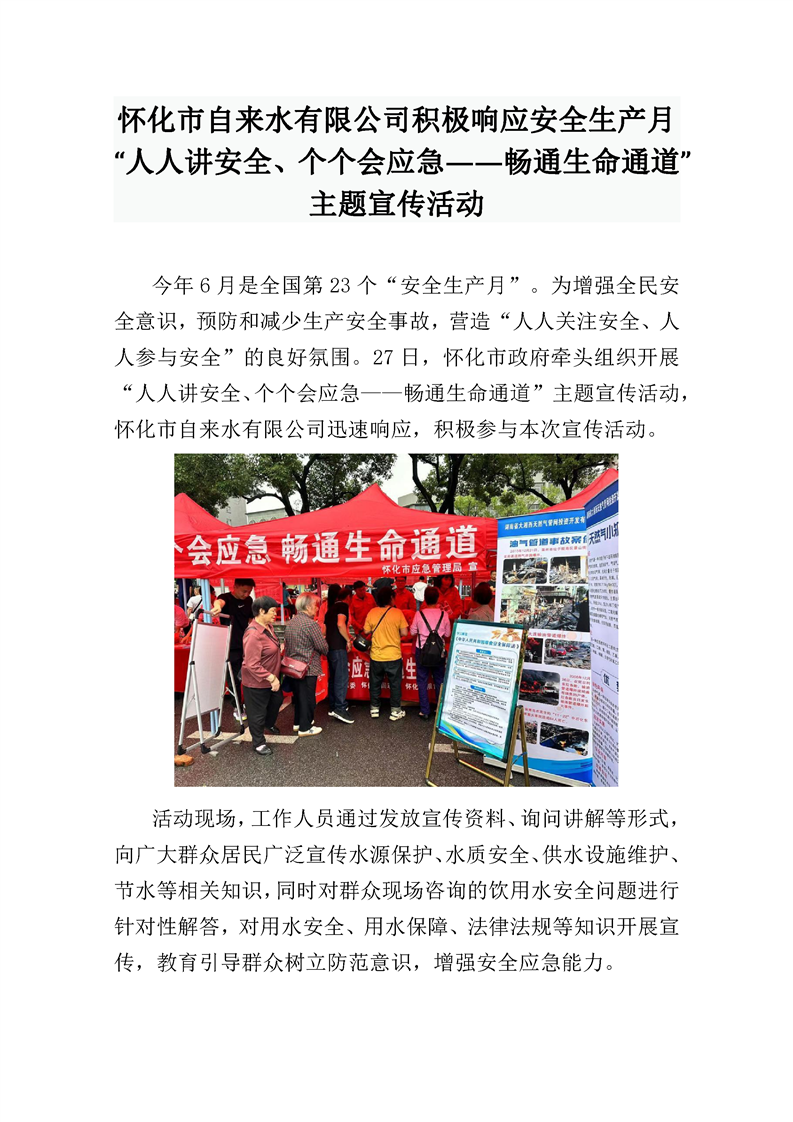 懷化市自來(lái)水有限公司積極響應安全生產(chǎn)月“人人講安全、個(gè)個(gè)會(huì )應急——暢通生命通道”主題宣傳活動(dòng)