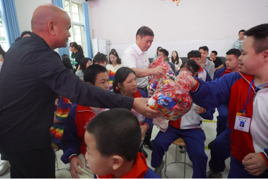 一首由特校學(xué)生帶來(lái)的舞蹈《向快樂(lè )出發(fā)》將儀式拉開(kāi)序幕?;顒?dòng)上,懷化市產(chǎn)業(yè)投資集團自來(lái)水有限公司為懷化市中心特校捐贈了6000元助學(xué)金及價(jià)值4000元的圖書(shū),并為260名特校學(xué)生送上了零食禮包。同學(xué)們在接過(guò)愛(ài)心的同時(shí),表達了最真摯的感激之情,學(xué)生代表汪佳霖在發(fā)言中表示,將把社會(huì )各界的關(guān)愛(ài)轉化為自強不息的動(dòng)力,以?xún)?yōu)異的成績(jì)回報社會(huì )和老師。